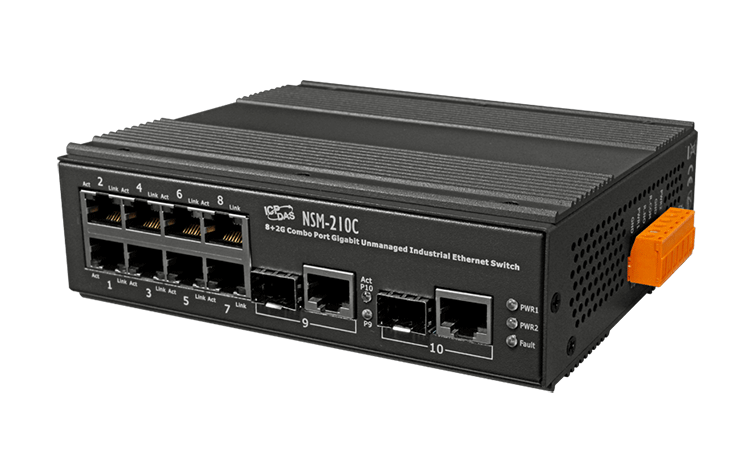 The NSM-210C is 8 Port 10/100 Base copper and 2 Gigabit fiber optic/copper combo port Ethernet Switch, Supports Auto Negotiation, Auto MDI/MDI-X, high-speed(100 Mbps) and high-distance transmissions . Apart from this, NSM-210C supports dual power and provides a wide +12 VDC ~ +48 VDC power range to fit all the common power standards found in industrial automation, without external power converters.
