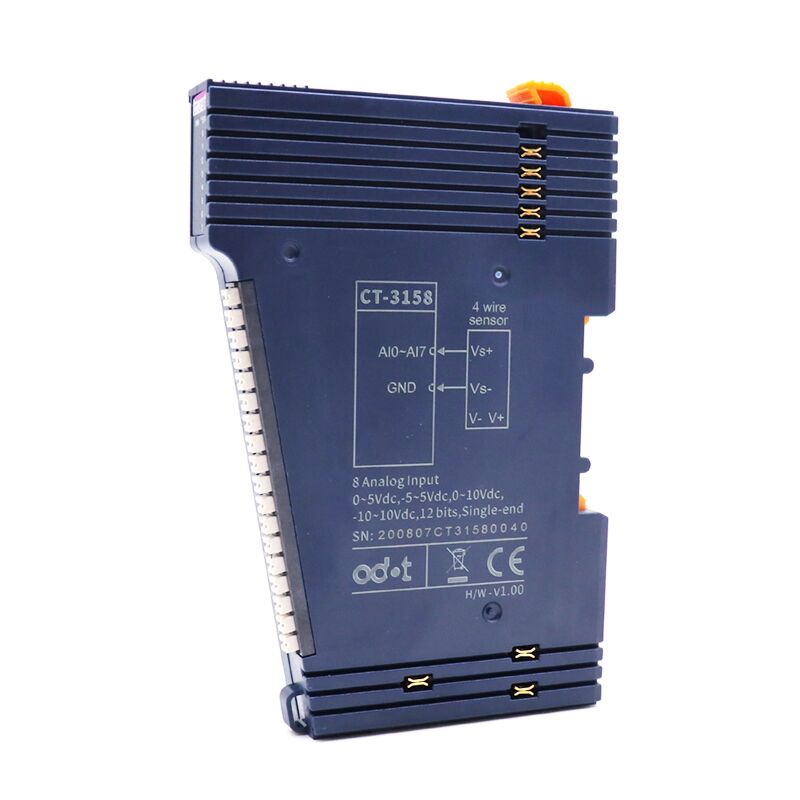 The ODOT CT-3158 is a 12-bit resolution 8 channel voltage input module that can be integrated with the ODOT Network Adapters to measure voltage inputs such as 0~5VDC/0~10VDC/±5VDC/±10VDC. This module is equipped with 8 analog input channel LED indicators and the input signals are single ended common grounding input.