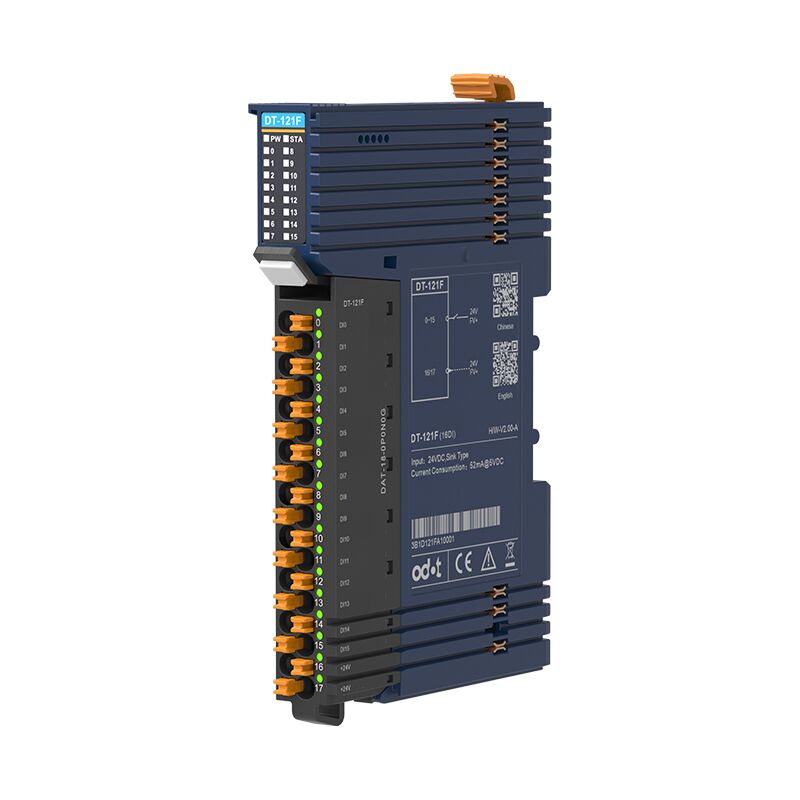 The ODOT DT-121F is an I/O expansion module that supports 16 channels digital (sink) input with 24 VDC voltage input and can be integrated with the ODOT Network Adapters. This module also supports the input signal holding function, and the holding time can be set and each input channel of the module supports a 32-bit counter with counting frequency <200Hz.