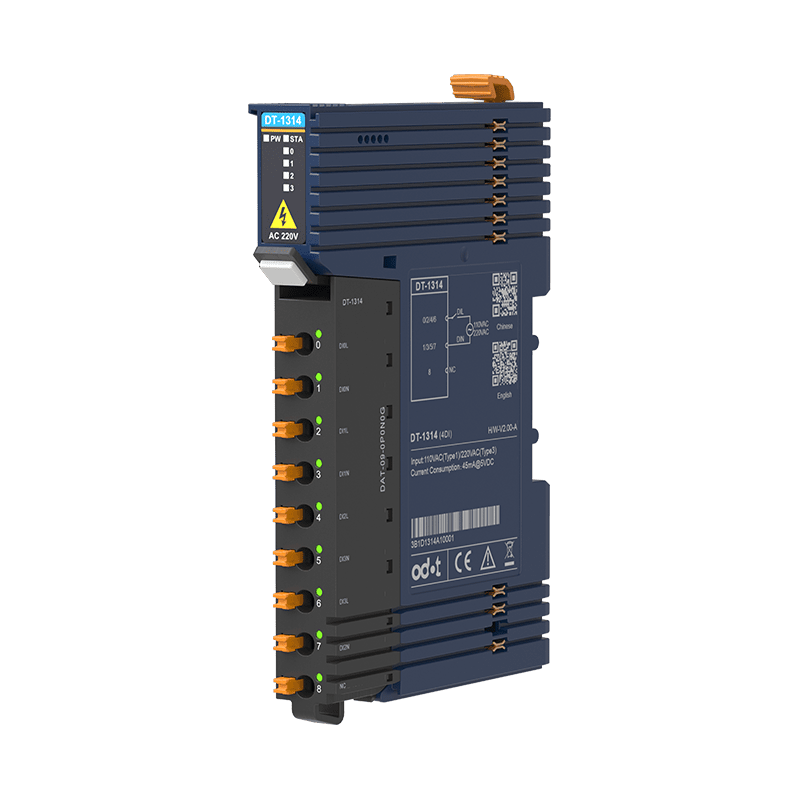 The ODOT DT-1314 is an I/O expansion module that supports 4 channels digital input with 110 VAC/220VAC voltage input and can be integrated with the ODOT Network Adapters. This module also supports the input signal holding function, and the holding time can be set and each input channel of the module supports a 32-bit counter with counting frequency <200Hz.