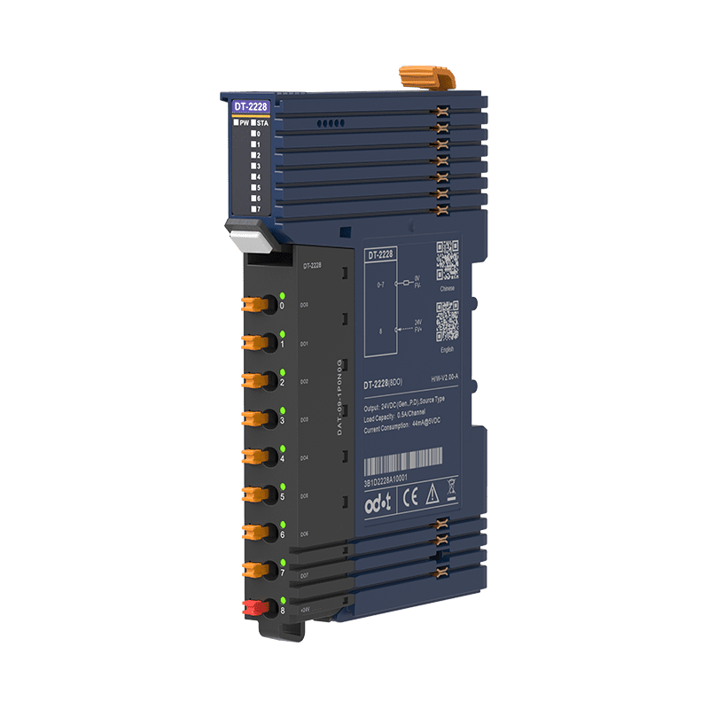 The ODOT DT-2228 is an I/O expansion module that supports 8-channel digital output, output high level effective, and output voltage 24V and can be integrated with the ODOT Network Adapters. This module could drive field equipment (relay, solenoid valve, etc.).