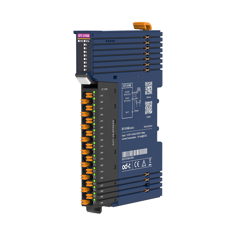 The ODOT DT-3168 is a 15/16-bit resolution 8 channel voltage input module that can be integrated with the ODOT Network Adapters to measure voltage inputs such as 0~5VDC/0~10VDC/±5VDC/±10VDC. This module is equipped with 8 analog input channel LED indicators and the input signals are single ended common grounding input.