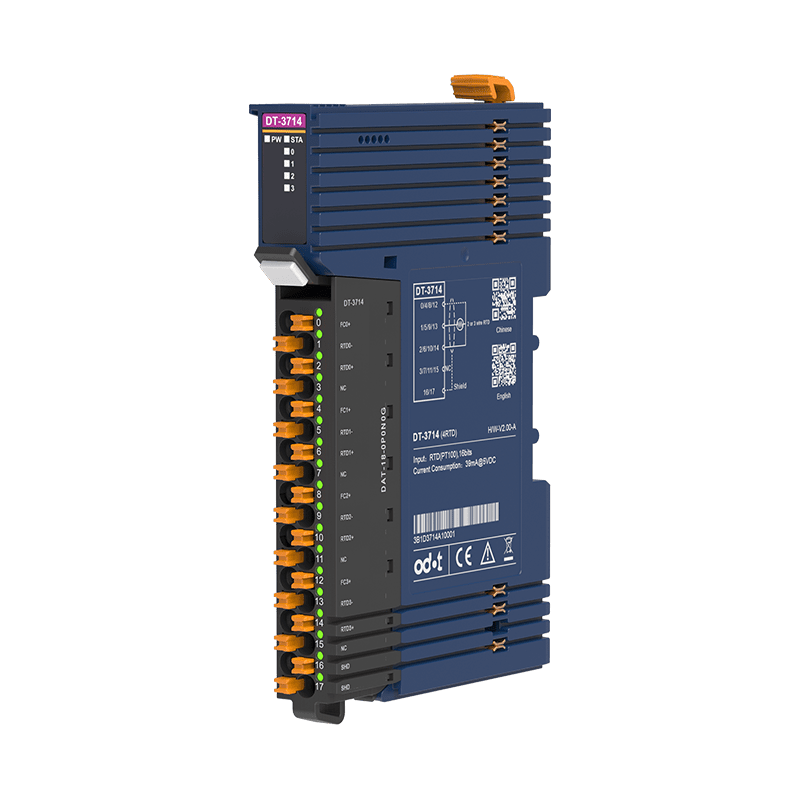The ODOT DT-3714 is a 4-channel RTD input module that can be integrated with the ODOT Network Adapters measure RTD-PT100 signals with adjustable filter level. The module support the PT-100 2-wire or 3-wire and fault detection (disconnection, short circuit, overflow, underflow, terminal state).