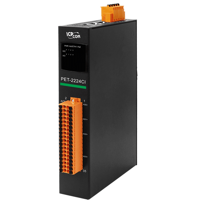 The ICP DAS PET-2224CI is a 4-channel analog output module with channel-to-channel isolation with Power over Ethernet function. All analog output channels can be individually configured with output ranges, including 0 ~ 5 V, 0 ~ 10 V, 4 ~ 20 mA, and 0 ~ 20 mA. The module can be set as voltage or current outputs via the software. It offers configurable AO power-on value and safe value settings, as well as open wire detection for each 4 ~ 20 mA output channel. The module complies with the RF (Radiated, radio-frequency) immunity of IEC 61000-4-3 standard and provides EMS (EFT/ESD/Surge) protection, 3000 VDC I/O isolation, and channel-to-channel isolation to enhance noise protection capabilities in industrial environments.