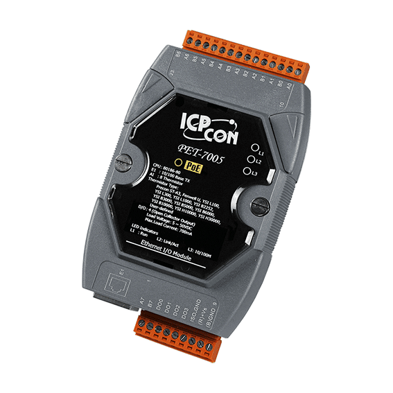 The PET-7005 also has 4-channel digital outputs for alarm output with Short-circuit protection and overload protection. The ICP DAS PET-7005 is equipped with Power over Ethernet (PoE) function and supports Modbus TCP protocol for seamless integration with SCADA software. Equipped with 2500 VDC intra-module isolation and 110 VDC/VAC over-voltage protection for thermistors makes the PET-7005 Ethernet IO module very reliable for resistance thermometer applications.