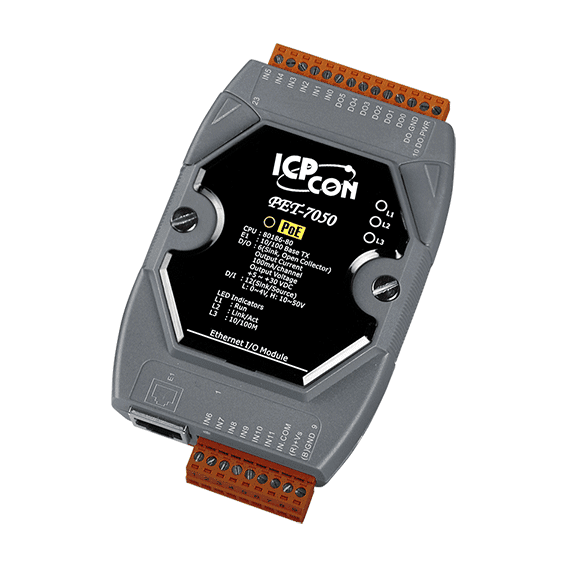 The ICP DAS PET-7050 supports IEEE 802.3af Power-Over-Ethernet (Class 1) specifications. By connecting to network devices that support the IEEE 802.3af PoE standard, power can be supplied via a copper Ethernet cable. The PET-7050 provides 6 sink-type digital output channels and 12 wet contact digital input channels, each of which is able to be used as a 32-bit counter.