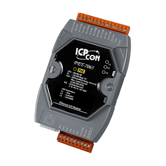 The PET-7065 is equipped with Power-over-Ethernet function and the power-on value and safe value of PhotoMOS relay are programmable. It can safely be used in industrial applications where hazardous voltages are present. The ICP DAS PET-7065 PoE IO modules are designed for industrial applications including Building Automation, Factory Automation, Machine Automation, Remote Maintenance, Remote Diagnosis and Testing Equipment.