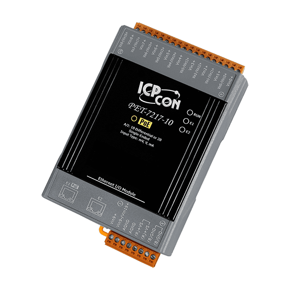 The ICP DAS PET-7217-10 is a module with 10-channel differential or 20-channel single-ended analog inputs. It provides programmable input range on all analog channels (+/-150 mV, +/-500 mV, +/-1 V, +/-5 V, +/-10 V, +/-20 mA, 0 ~ 20 mA and 4 ~ 20 mA). Each analog channel is allowed to configure an individual range and has 240 Vrms high overvoltage protection.