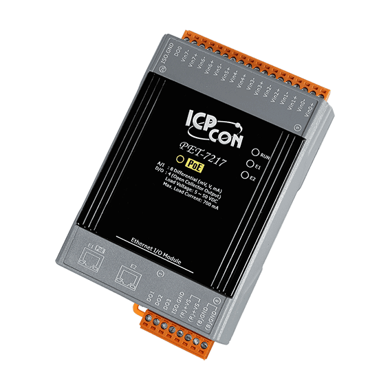 The ICP DAS PET-7217 is a module with 8-channel differential analog inputs and 4-channel digital outputs with Power over Ethernet (PoE) feature. It provides programmable input range on all analog channels (+/-150 mV, +/-500 mV, +/-1 V, +/-5 V, +/-10 V, +/-20 mA, 0 ~ 20 mA and 4 ~ 20 mA) and digital output can be set alarm output with Short-circuit protection and overload protection.