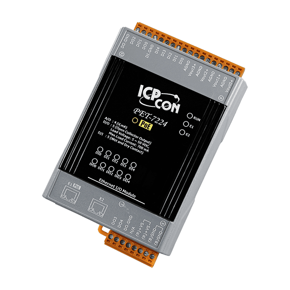 The ICP DAS PET-7224 is a multifunction module includes 4 channels analog output, 5 channels digital input and 5 channels digital output with Power over Ethernet. It provides a variety of programmable analog output options (+/-5 V, +/-10 V, 0 ~ 20 mA and 4 ~ 20 mA), and each analog output can be programmed to accept either current or voltage as output depending upon the position of corresponding jumper. The ICP DAS PET-7224 is fully RoHS compliant and provides 4 kV ESD protection as well as 2500 VDC intra-module isolation.
