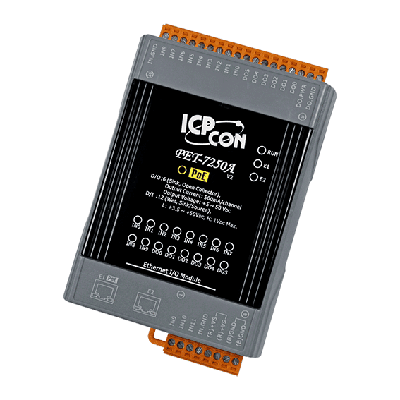 The ICP DAS PET-7250A provides 6 sink-type digital output channels and 12 wet contact digital input channels, each of which is able to be used as a 32-bit counter. In addition, each digital input of PET-7250A accepts either dry contact or wet contact.