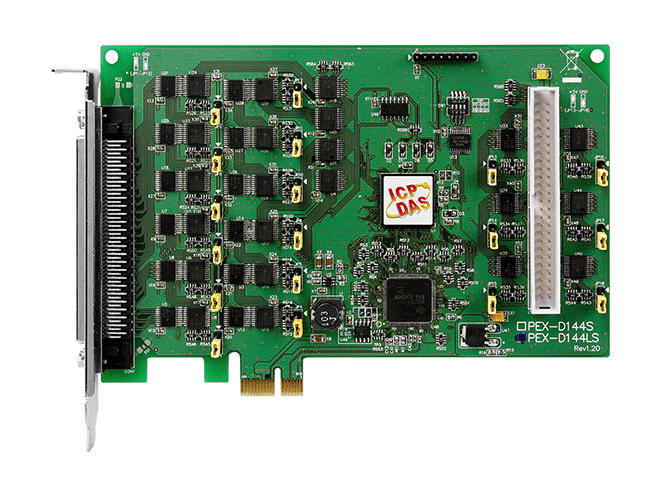 The PEX-D144LS provides a high-density connector that reduces the amount of installation space required for the card in the computer. The ICP DAS PEX-D144LS cards include an onboard Card ID switch that enables the board to be recognized via software if two or more boards are installed in the same computer. The ICP DAS PEX-D144LS also adds pull-high/low jumpers allow the DI status to be predefined instead of remaining floating if the DI channels are disconnected or interrupted.