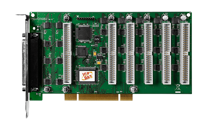 The ICP DAS PIO-D168U universal PCI card supports 3.3 V/5 V PCI bus. These cards provide 168 TTL digital I/O lines, and these lines are grouped into eighteen 8-bit bi-direction ports. Every three ports on a connector are grouped and named as port A (PA), port B (PB) and port C (PC) respectively. All ports are configured as inputs upon power-up or reset.