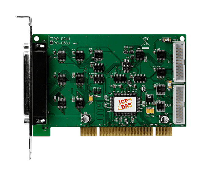 The ICP DAS PIO-D56U supports 3.3 V/5 V PCI bus. The PIO-D56U consists of three 8-bit bi-direction ports. The 8-bit ports are named as port A (PA), port B (PB) and port C (PC) respectively. All ports are configured as inputs upon power-up or reset. In addition, the ICP DAS PIO-D56 provides additional 16-bit DIs and 16-bit DOs.