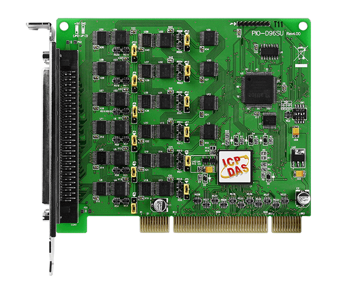 The ICP DAS PIO-D96SU supports 3.3 V/5 V PCI bus. These cards provide 96 TTL Digital I/O lines that consist of twelve 8-bit bi-directional ports. Each group of three 8-bit ports is arranged on the connector as Port A (PA), Port B (PB) and Port C (PC), respectively, and all ports are configured as inputs ports on power-up or after a reset.