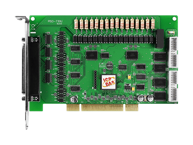 The ICP DAS PISO-730U universal PCI card supports 3.3 V/5 V PCI bus and provide 32 isolated digital I/O channels (16 x DI and 16 x DO) and 32 TTL-level digital I/O channels (16 x DI and 16 x DO). Both the isolated DI and DO channels use a short optical transmission path to transfer an electronic signal between the elements of a circuit and keep them electrically isolated. With 3750 Vrms isolation protection, these DIO channels allow the input signals to be completely floated so as to prevent ground loops and isolate the host computer from damaging voltages. Each DO offers a Darlington (NPN) transistor and integrated suppression diode for the inductive load. The open collector outputs (DO channels) are typically used for alarm and warning notification, signal output control, control for external circuits that require a higher voltage level, and signal transmission applications, etc.