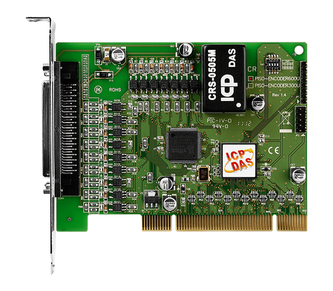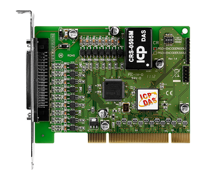 The ICP DAS PISO-ENCODER600U contains a 6-axis encoder counter and each axis has a 32-bit, true counter with a maximum encoder counting rate of 4 MHz. The counting mode can be selected from three types: 1. Quadrant mode, 2. CW/CCW mode, and 3. PULSE/ DIR mode. There are also three 3 kinds of counter reset modes provided: 1. Register Reset, 2. Index Reset, and 3. Hardware Reset. The “Index Reset” mode resets by using a C+/C- channel, which will reset the counter on each revolution. The “Hardware Reset” mode resets the counter using an external pin (HR1 ~ HR6). The HR1 ~ HR6 pins can also be used as digital input.