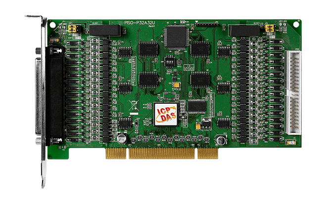 The ICP DAS PISO-P32A32U universal PCI card supports 3.3 V/5 V PCI bus. These cards provide 32 optically-isolated DI channels and 32 optically-isolated DO channels, arranged into four isolated banks. Each DO channel includes a PNP transistor and an integral suppression diode for the inductive load. Isolated input channels 0-15 are allocated to Group A, while channels 16-31 are allocated to Group B. Isolated output channels are allocated to Groups C and D. The photocoupler input for the PISO-P32A32U can be powered by either an internal current source or an external power supply, while the input for the ICP DAS PISO-P32A32U operates using an external power supply only.