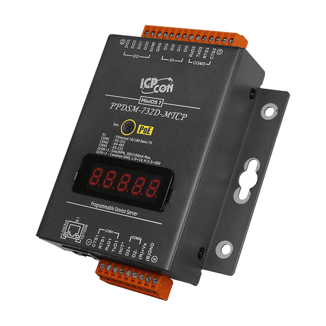 PPDSM-732D-MTCP Programmable (2x RS-232 and 1x RS-485) Serial-to-Ethernet Device Server with 4x DI, 4x DO, PoE, Modbus Gateway and LED Display (Metal Case)