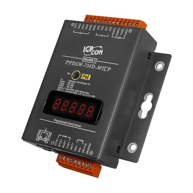 PPDSM-734D-MTCP Programmable (1x RS-232, 1x RS-485 and 1x RS-422/485) Serial-to-Ethernet Device Server with 4x DI, 4x DO, PoE, Modbus Gateway and LED Display (Metal Case)