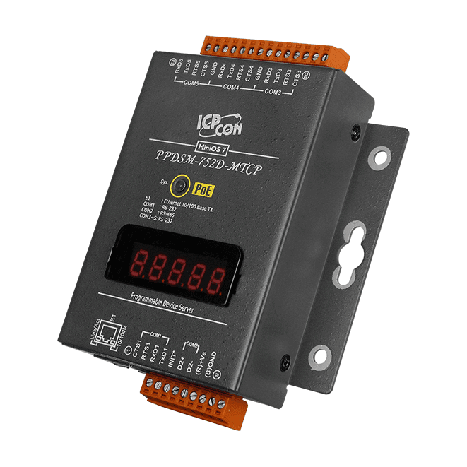 PPDSM-752D-MTCP Programmable (4x RS-232 and 1x RS-485) Serial-to-Ethernet Device Server with PoE, Modbus Gateway and LED Display (Metal Case)