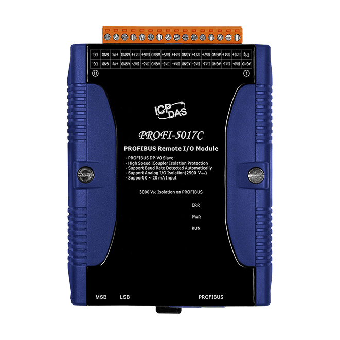The ICP DAS PROFI-5017C is specially designed for the slave device of PROFIBUS DP protocol. This module supports up to 8-channel isolated analog current input with 2500Vrms field to logic isolation. The PROFI-5017C offer users the flexibility to choose and configure this module via the GSD file in any PROFIBUS configuration.