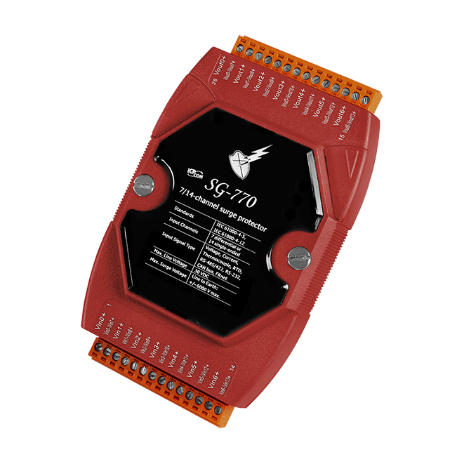 The ICP DAS SG-770 offers seven differential for surge protection. The SG-770 surge protection unit is approved with IEC 61000-4-5 and IEC 61000-4-12 standards and each channel supports 0 V ~ ±30 V signal and each of channels is protected for surge up to 6 kV.