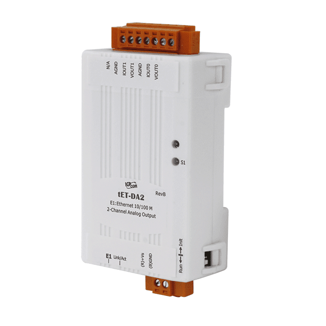 The tET-DA2 is a 2-channel 12-bit analog output Ethernet I/O module with a programmable output range on all analog outputs (0 ~ 10 V, 0 ~ 20 mA, 4 ~ 20 mA).