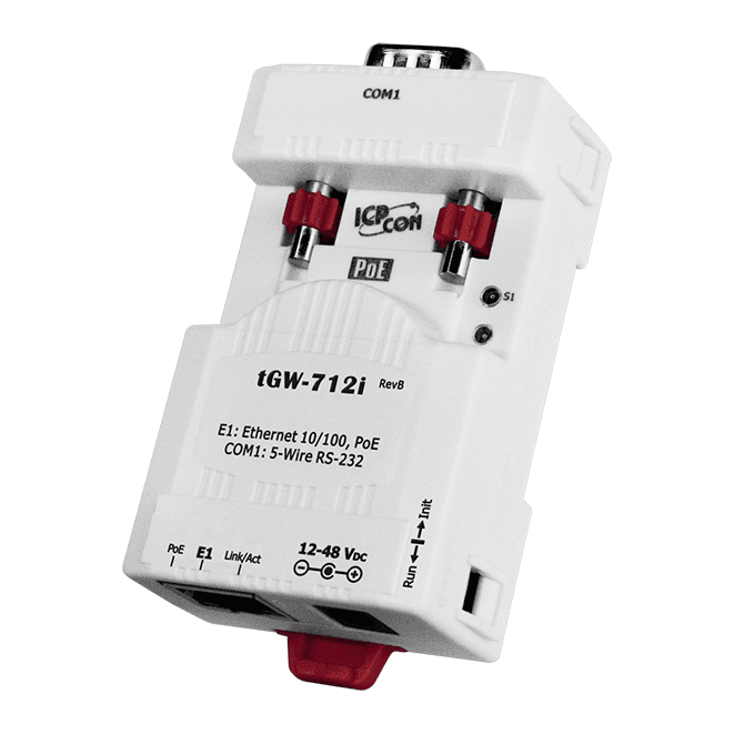The ICP DAS tGW-712i is a tiny Modbus/TCP to RTU/ASCII Gateway with PoE and 1 isolated RS-232 port.