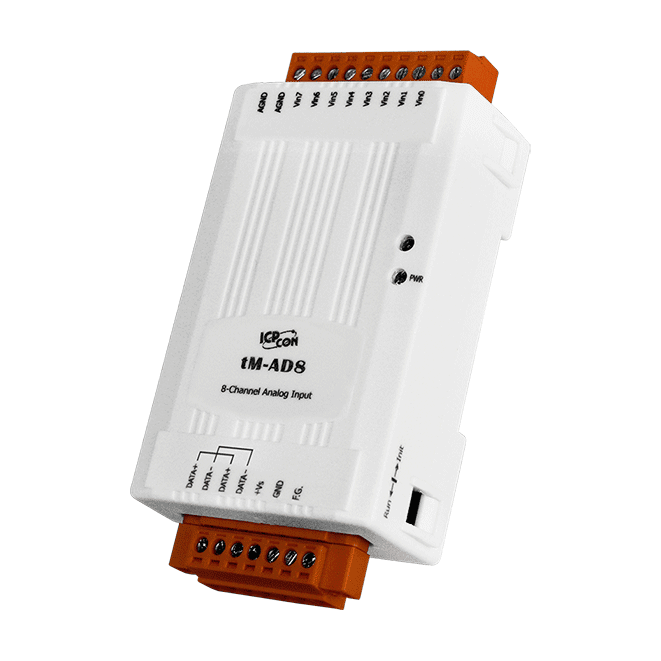 The ICP DAS tM-AD8 is an analog input module with 8 single-ended analog input channels and provides a programmable input range on all analog inputs (0 ~ 500 mV, 0 ~ 1 V, 0 ~ 2.5 V, 0 ~ 5 V, 0 ~ 10 V). The ICP DAS tM-AD8 also provides a high over-voltage protection of 120 VDC.