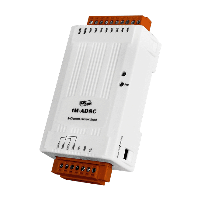 The ICP DAS tM-AD8C is a current input module that includes 8 single-ended analog input channels and provides a programmable input range on all analog inputs (0 ~ 20 mA, 4 ~ 20 mA).
