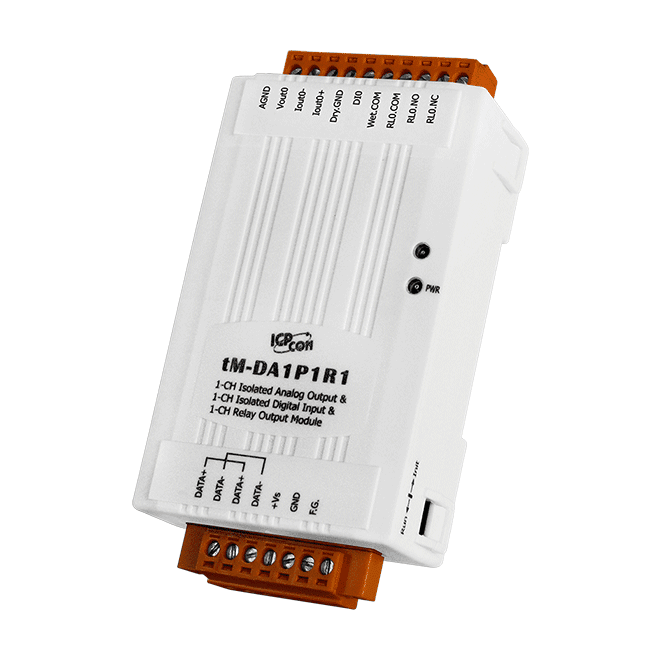 The ICP DAS tM-DA1P1R1 is an RS-485 Interface module that offers 1 analog output channel, 1 digital input channel and 1 relay output channel. Analog output resolution is 12-bit with an output range of 0~10V and 0~20mA. The Digital input channel is dry contact type and provides a 16-bit counter function. The Relay output type is a Form C, and all I/O terminals provide 4 kV ESD protection and 3 kV intra-module isolation.