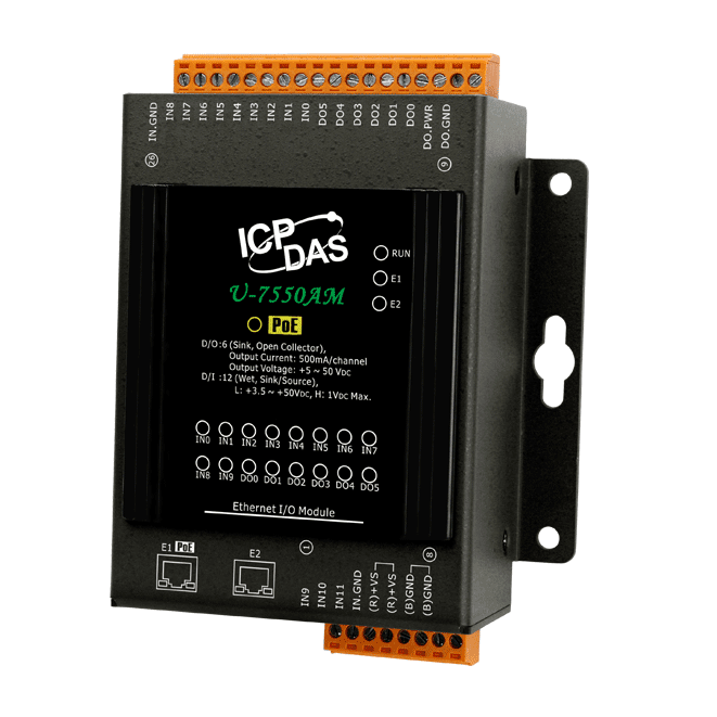 The ICP DAS U-7550AM is an OPC UA I/O module that provides 12-channels digital input, 6-channels digital output channels. It has a built-in two-port Ethernet switch to implement daisy-chain topology. The cabling is much easier and total costs of cable and switch are significantly reduced. The ICP DAS U-7550AM follows IEEE 802.3af compliant Power over Ethernet (PoE) specification. It allows receiving power from PoE enabled network by Ethernet pairs. This feature provides greater flexibility and efficiency to simplify system design, save space, and reduce wiring and power sockets. It provides a Web UI to configure/control/monitor the modules, connections, and I/O status via a web browser. It is easy, fast, and no extra APP needed.