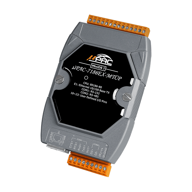 The ICP DAS uPAC-7186EX-MTCP is a family of Programmable Device Servers, also known as “Serial-to-Ethernet gateway”, that are designed for linking RS-232/485 devices to an Ethernet network. The μPAC-7186EX-MTCP also works as a Modbus TCP to RTU gateway that supports most SCADA/HMI communications based on the Modbus TCP protocol.