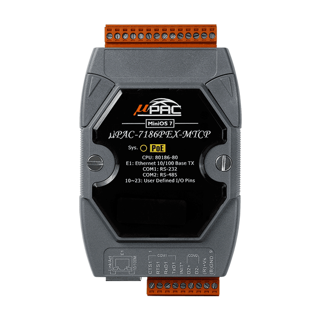 The ICP DAS uPAC-7186PEX-MTCP is a family of Programmable Device Servers, also known as “Serial-to-Ethernet gateway”, that are designed for linking RS-232/485 devices to an Ethernet network. The μPAC-7186PEX-MTCP also works as a Modbus TCP to RTU gateway that supports most SCADA/HMI communications based on the Modbus TCP protocol with Power over Ethernet (PoE) function.