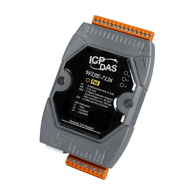 The ICP DAS WISE-7126 follows IEEE 802.3af-compliant (classification, Class 1) Power over Ethernet (PoE) specification. It provides power from PoE enabled network by Ethernet pairs (Category 5 Ethernet cable). This feature provides greater flexibility and higher efficiency therefore simplifying systems design, saving space, reducing cables and eliminating the requirement for dedicated electrical outlets. Meanwhile, in case under a non-PoE environment, WISE-7126 can be powered from auxiliary power sources such as AC adapters or battery. This multi-function module ICP DAS WISE-7126 supports Modbus/TCP protocol to make seamless integration with SCADA software. It features 6-channel analog inputs, 2-channel analog outputs, 2-channel digital inputs and 2-channel digital outputs. Each analog channel has 240 Vrms high over voltage protection.