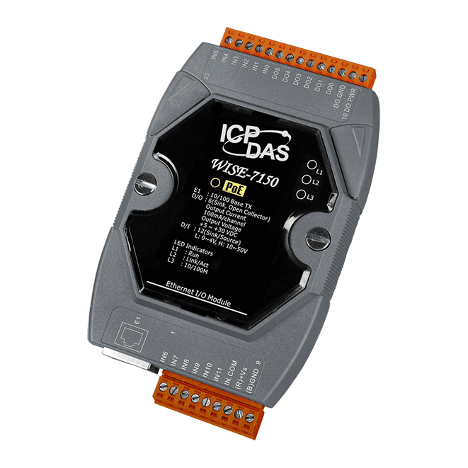 The ICP DAS WISE-7150 follows IEEE 802.3af-compliant (classification, Class 1) Power over Ethernet (PoE) specification. It provides power from PoE enabled network by Ethernet pairs (Category 5 Ethernet cable). This feature provides greater flexibility and higher efficiency therefore simplifying systems design, saving space, reducing cables and eliminating the requirement for dedicated electrical outlets. Meanwhile, in case under a non-PoE environment, WISE-7150 can be powered from auxiliary power sources such as AC adapters or battery. This multi-function module ICP DAS WISE-7150 supports Modbus/TCP protocol to make seamless integration with SCADA software. It features 6-channel isolated open collector outputs and 12-channel isolated wet contact digital inputs. Each output channel supports 100 mA currnet driving @ 5 ~ 30 VDC and each digital input channel supports counter input.