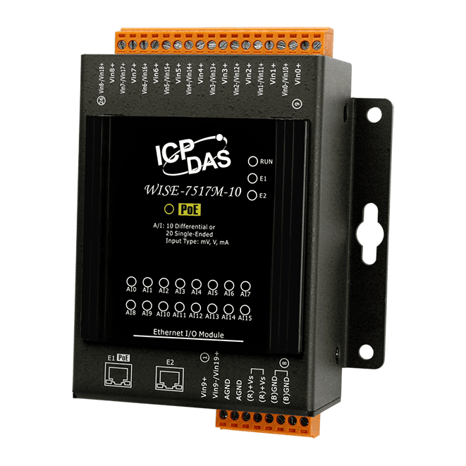 ICP DAS WISE-7517M-10 is a module with 10-channel differential or 20-channel single-ended analog inputs. It provides programmable input range on all analog channels. Each analog channel has 240 Vrms high overvoltage protection. Each analog input can be programmed to accept voltage or current as input depending upon the position of corresponding jumper. It also has qualification for 4 kV ESD protection as well as 3000 VDC intra-module isolation. WISE-7517M-10 follows IEEE 802.3af-compliant Power over Ethernet (PoE) specification. It allows receiving power from PoE enabled network by Ethernet pairs. In additional to this, WISE-7517M-10 also has a built-in two-port Ethernet switch to implement daisy-chain topology. The cabling is much easier and total costs of cable and switch are significantly reduced.