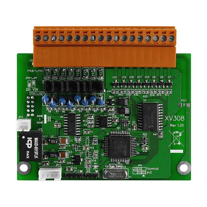 The ICP DAS XV308 provides 8 channels for analog input and 8 channels for universal digital input/output. Analog Input channels are Single-ended type and provide a programmable input range (±1 V, ±2.5 V, ±5 V, ±10 V, ±20 mA, 0 ~ 20 mA, 4 ~ 20 mA).