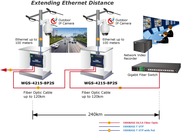 The WGS-4215-8P2S provides 8 10/100/1000Mbps 802.3at PoE ports which can offer sufficient PoE power to 8 PoE IP cameras at the same time. In addition, with the 2 100/1000BASE-X SFP interfaces, the WGS-4215-8P2S can connect to a core fiber switch and send video streams to an NVR and monitoring center.