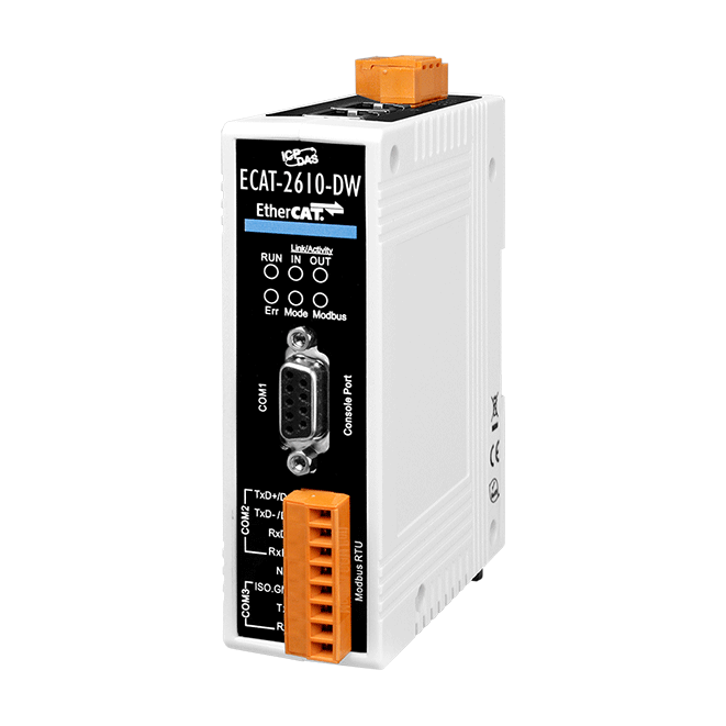 The ICP DAS ECAT-2610-DW EtherCAT Slave to Modbus RTU Master gateway integrate your serial RS-232/422/485 based industrial devices and equipment to an EtherCAT control system without the need for any changes to the device.The ICP DAS ECAT-2610-DW communicator is a proven and trusted protocol converter gateway that connects non-networked industrial devices and equipment to EtherCAT.