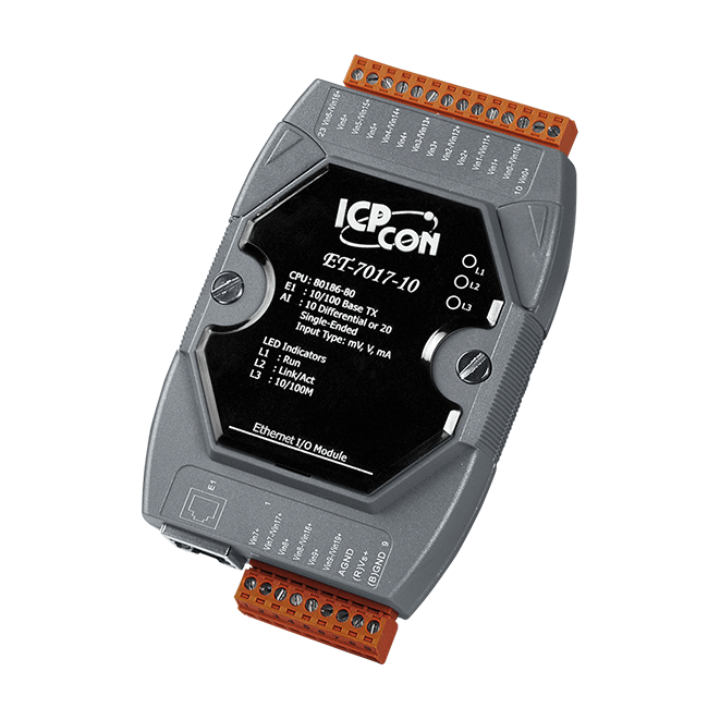The ICP DAS ET-7017 is a module with 8-channel differential analog inputs and 4-channel digital outputs. It provides programmable input range on all analog channels (+/-150 mV, +/-500 mV, +/-1 V, +/-5 V, +/-10 V, +/-20 mA, 0 ~ 20 mA and 4 ~ 20 mA) and digital output can be set alarm output with Short-circuit protection and overload protection.