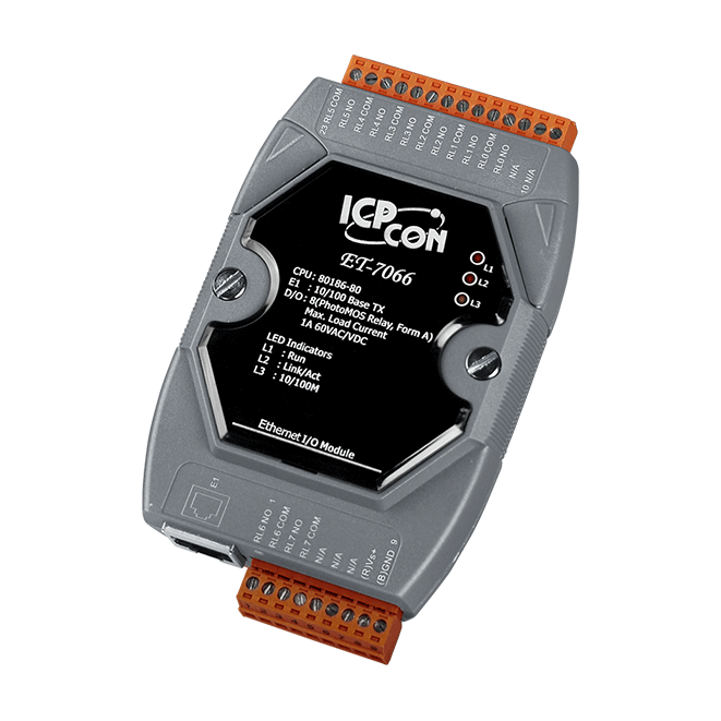 The ICP DAS ET-7066 provides 8 form A PhotoMOS relays. It features optical isolation for 3000 Vrms of transient overvoltage protection and doesn’t have channel-to-channel isolation. The power-on value and safe value of the PhotoMOS relay are programmable. The ICP DAS ET-7066 can be safely used in applications where hazardous voltages are present.