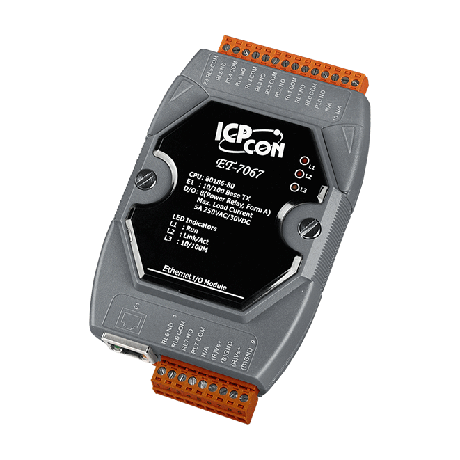 The ICP DAS ET-7067 provides 8 form A electro-mechanical relays. It features optical isolation for 3000 VDC of transient over-voltage protection and doesn’t have channel-to-channel isolation. The power-on value and safe value of relay are programmable.