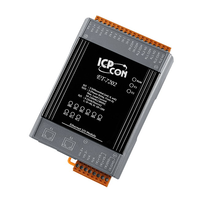 The ICP DAS ET-7202 is a multi-function module with 3-channel analog inputs, 6-channel digital inputs and 3-channel relay outputs. It provides various programmable analog inputs (+/-150 mV, +/-500 mV, +/-1 V, +/-5 V, +/-10 V, +/-20 mA, 0 ~ 20 mA and 4 ~ 20 mA). Each analog input is allowed to configure a proper range with 240 Vrms high voltage protection.