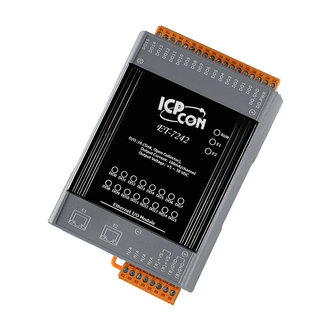 The ICP DAS ET-7242 provides 16 sink-type digital output channels. It features optical isolation for 3750 VDC of transient overvoltage protection and doesn’t have channel-to-channel isolation.
