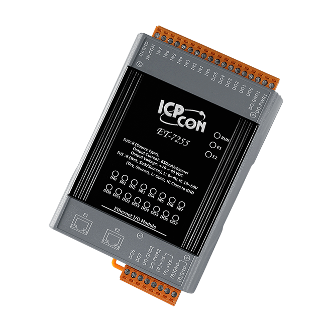 The ICP DAS ET-7255 provides 8 Dry/wet contact digital input channels and 8 source-type digital output channels. It features optical isolation for 2500 VDC of transient over-voltage protection but doesn’t provide channel-to-channel isolation. Each input channel can be used as a 32-bit counter and each output channel can drive 650 mA load. The power-on value and safe value of digital output channel are programmable. It can safely be used in applications where hazardous voltages are present.
