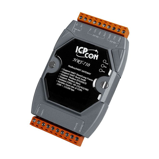 The ICP DAS HRT-710 Gateway is specially designed for the master device of HART protocol. It allows the Modbus master to access the HART devices such as transmitters, actuators and other. In addition, software utility, HG_Tool, are available for module configuration and HART device diagnosis.