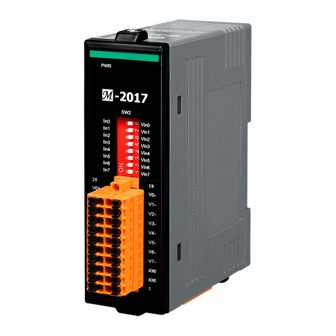 The sampling rate for the M-2017 module is adjustable and can be set to either fast or normal mode. The module also features per-channel open wire detection for current input of 4 to 20 mA, and provides 8 kV ESD protection, 4 kV EFT protection, 2 kV surge protection, and 3000 VDC intra-module isolation. The ICP DAS M-2017 module supports both the Modbus RTU and DCON protocols, which can be configured via software.