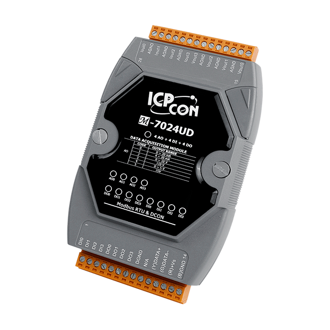 The ICP DAS M-7024U/M-7024UD is a multi-function module that includes 4 analog output channels, 4 digital input channels, and 4 digital output channels. It provides a programmable output range on all analog output channels (0 ~ 5 V, ±5 V, 0 ~ 10 V, ±10 V, +4 ~ +20 mA, or 0 ~ +20 mA). Each analog output channel can be configured for an individual range.
